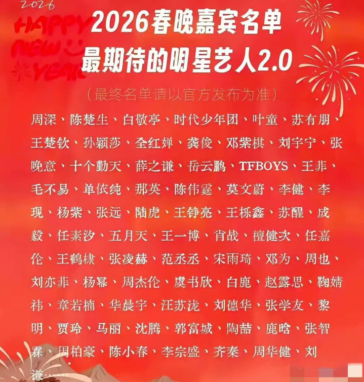 2026年春晚的筹备透着满满的革新诚意。80后跨界总导演的任用,“短节目优先、全民参与”的创作理念,120分钟的精炼时长,精准契合当下观众的碎片化观看习惯。AI笑果预测模型、VR平行现场、元宇宙分会场等技术创新,搭配成都、喀什、哈尔滨三大实体分会场的地域特色,让晚会既有科技感又接烟火气。“开门迎春晚”活动24小时内收获上万条网友创意,皮影戏、非遗戏曲等民间智慧有望登上大雅之堂,让春晚真正回归大众。